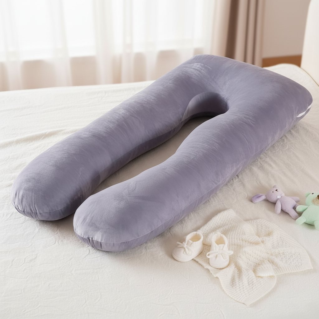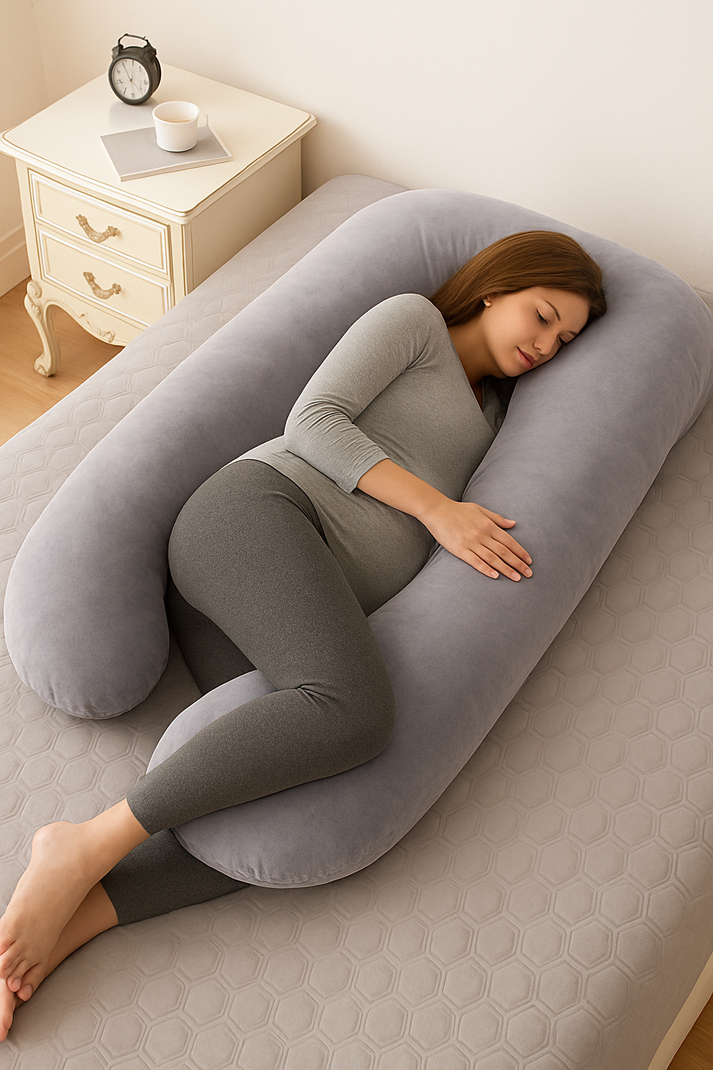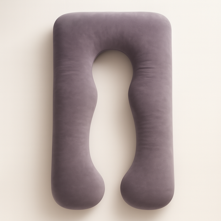 U-förmiges Ganzkörperkissen aus weichem, mattem Grau perfekt für erholsamen Schlaf und optimale Unterstützung von Rücken, Nacken und Beinen.